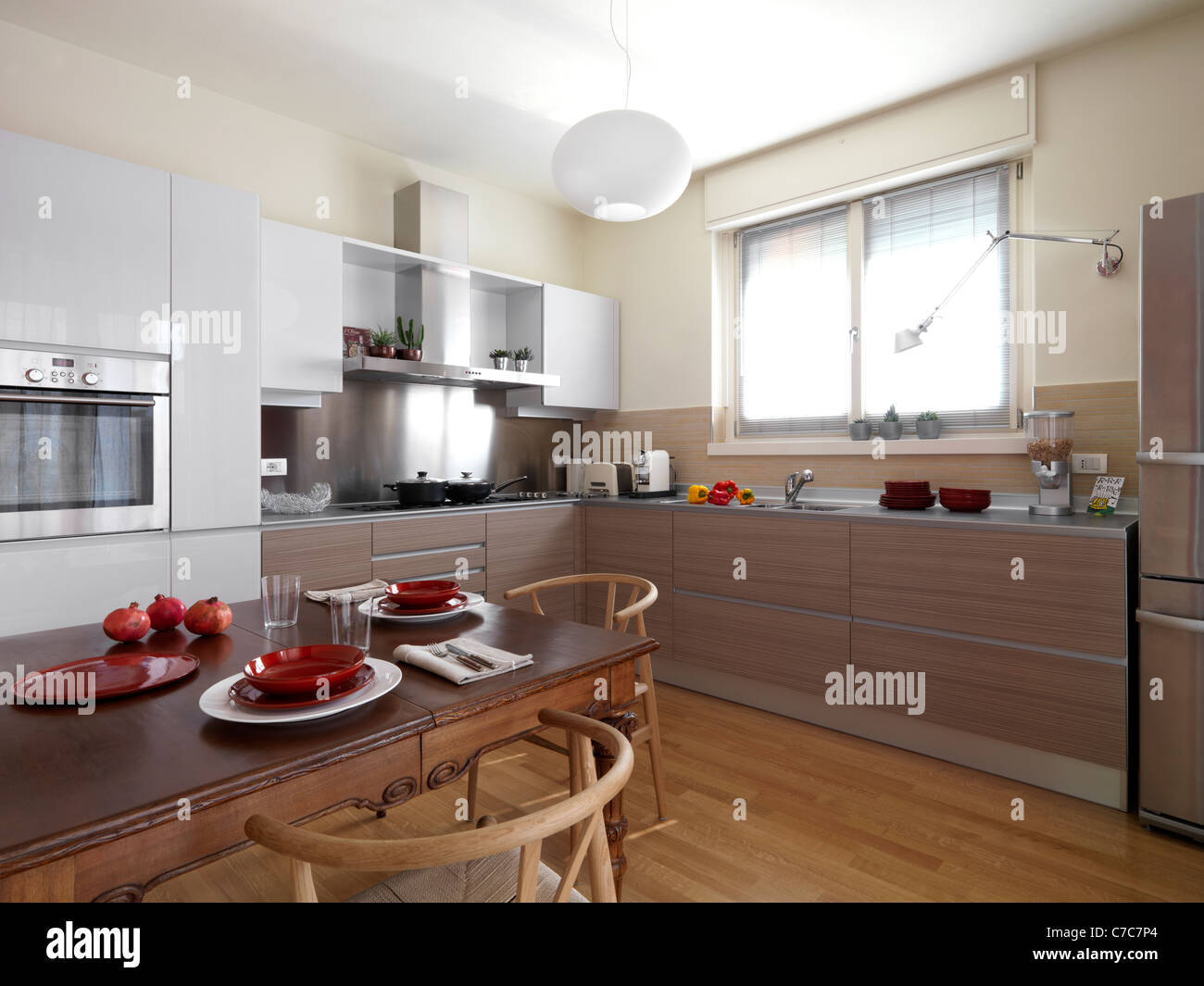 Holz Moderne Kuche Mit Stahl Gerate Und Holzboden Stockfoto