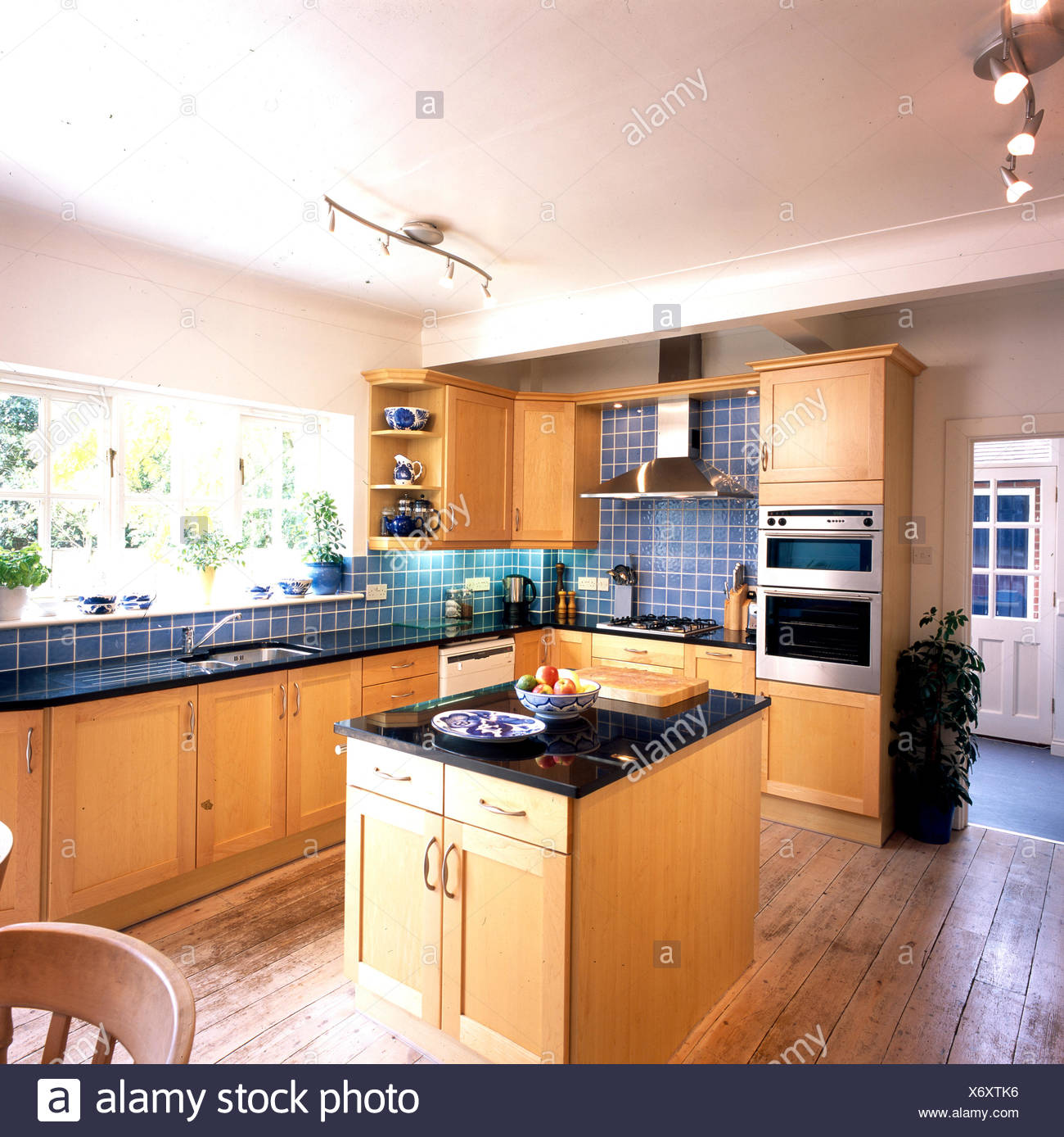 Kochinsel In Der Kuche Mit Blauen Fliesen Und Holzboden