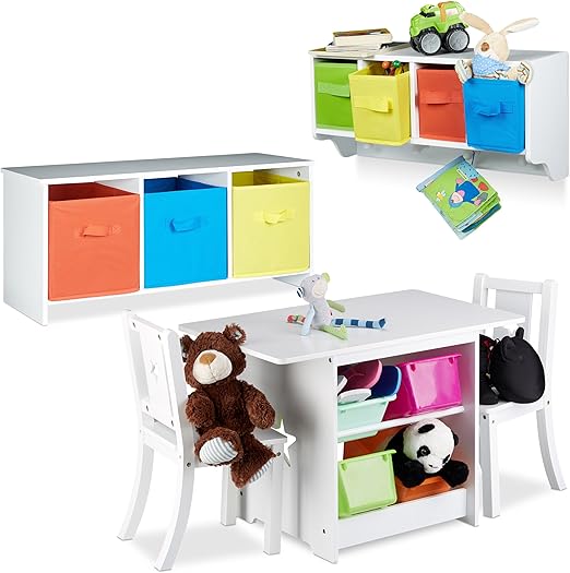Relaxdays 3 Tlg Kindermobel Set Albus Wandregal Fur Kinder Sitzbank Mit Stauraum Kindersitzgruppe Mit 2 Stuhlen Faltbox Weiss