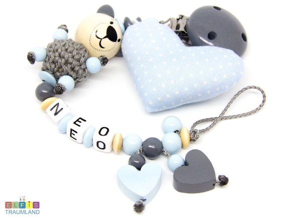 Schnullerkette Mit Namen Junge Stoffherz Hellblau Grau Bar Etsy